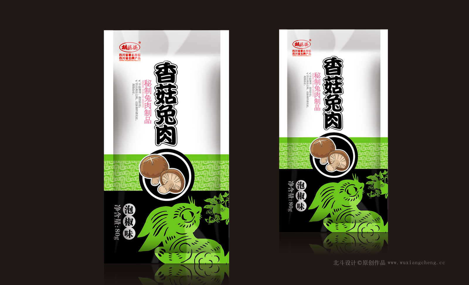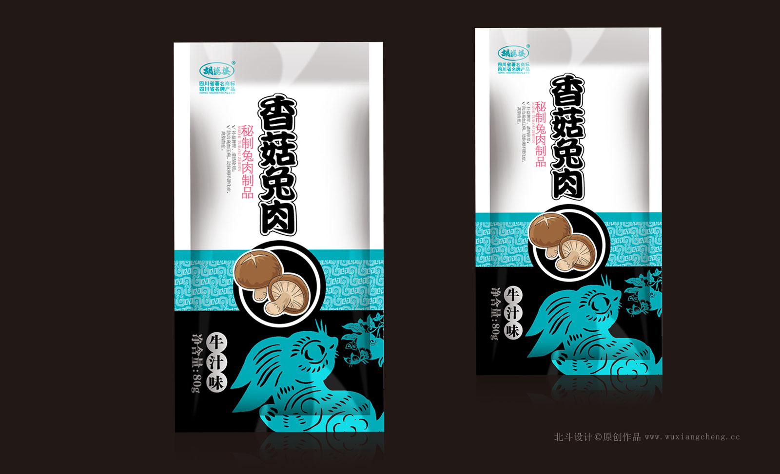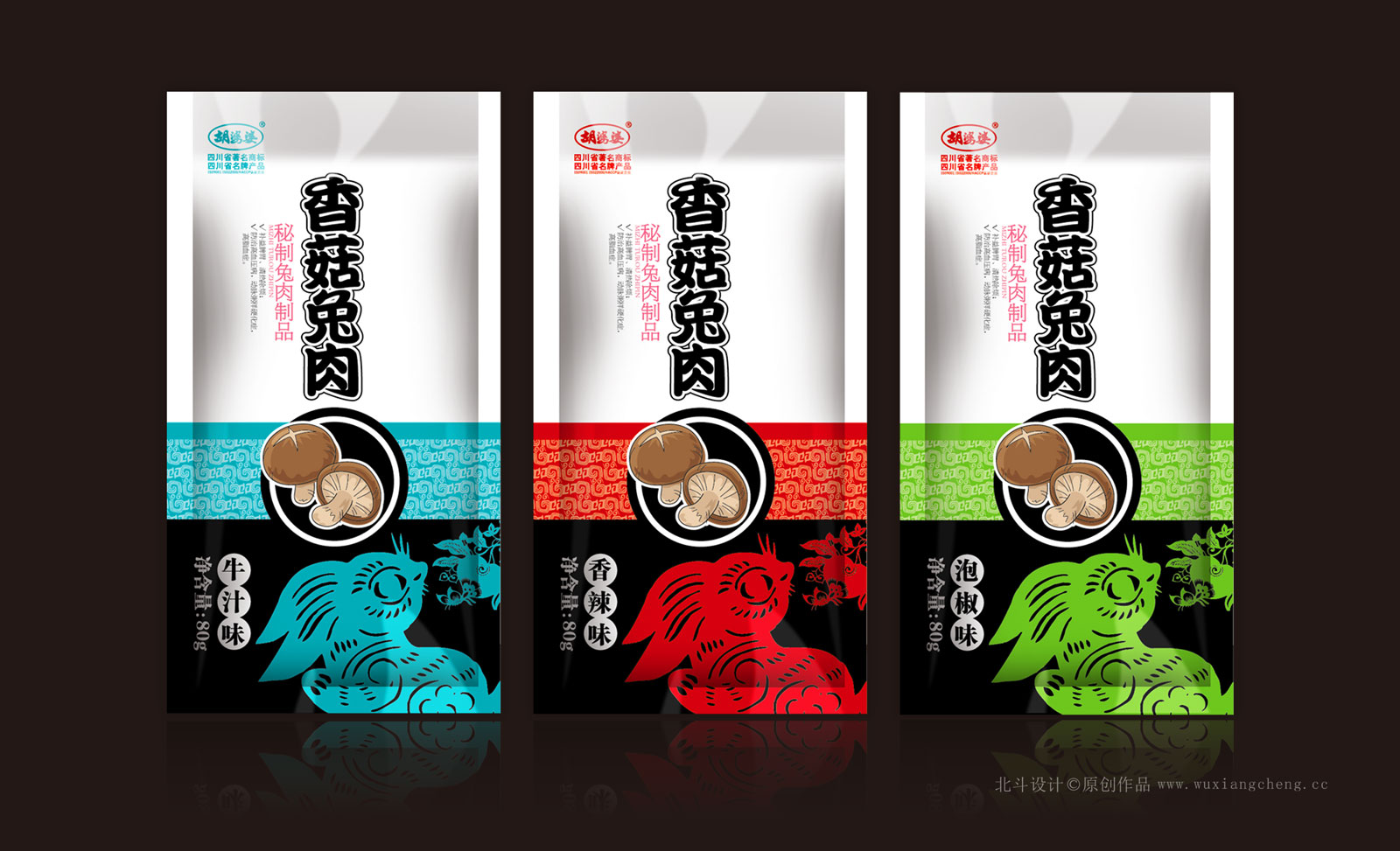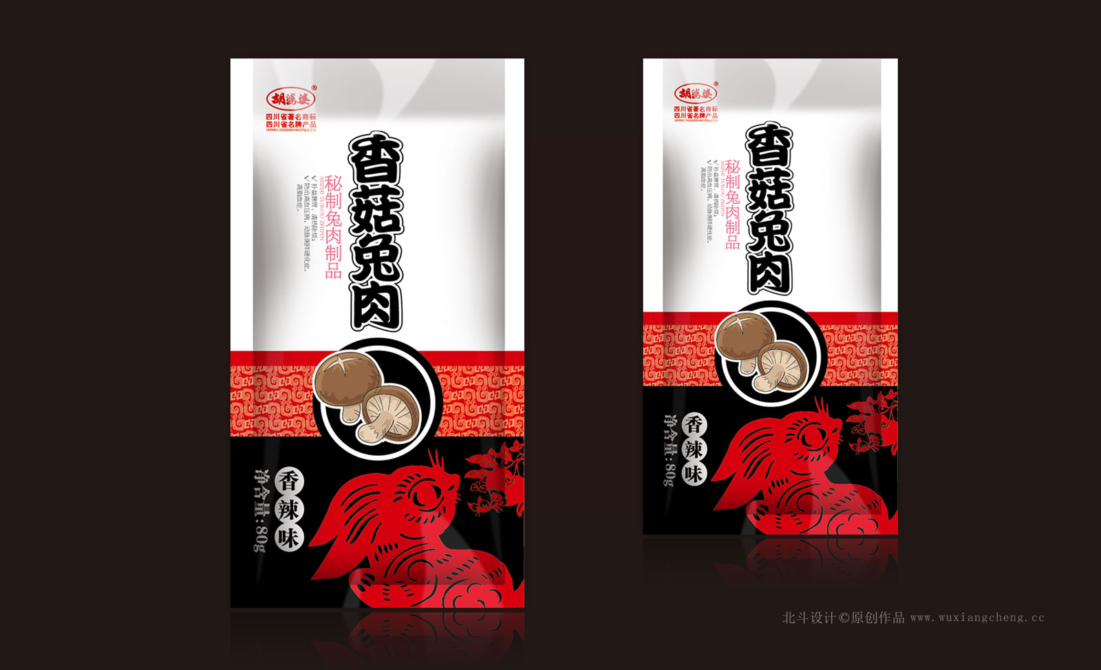 Hu mother-in-law mushroom rabbit series is divided into three: cow juice taste and fragrant spicy, pickled flavor. In order to be able to handle the mother-in-law hu family brand recognition system, we will keep the hu mother-in-law particular background brand symbol.