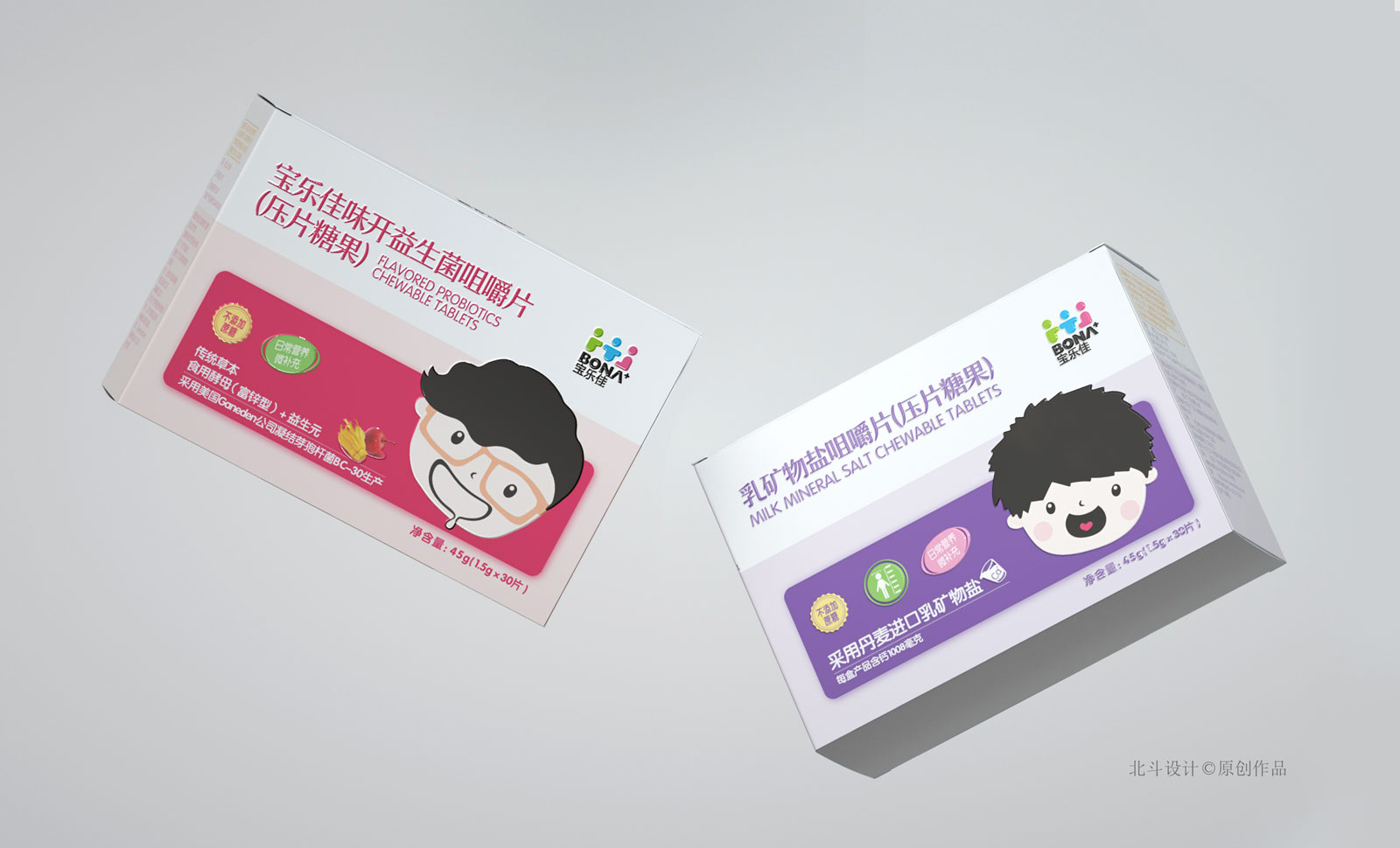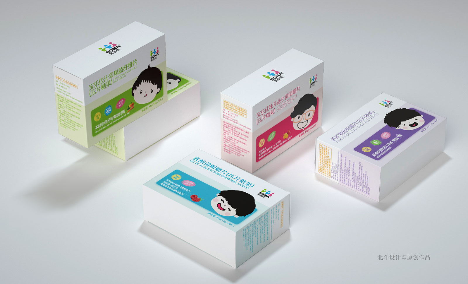 寶樂佳這款壓片糖果系列包裝設(shè)計(jì),在同類產(chǎn)品中定位是中高端,所以在產(chǎn)品包裝的設(shè)計(jì)工藝,和設(shè)計(jì)美學(xué)上都是比較高的要求。北斗設(shè)計(jì)采用的創(chuàng)意符號(hào)是兒童卡通表情符號(hào),通過不同的表情符號(hào)表現(xiàn)不同類型的糖果,通過卡通的趣味心態(tài)帶給用戶更有趣的體驗(yàn)感;色彩表現(xiàn)采用的是粉色系,這種色系更能受到兒童用戶的青睞。