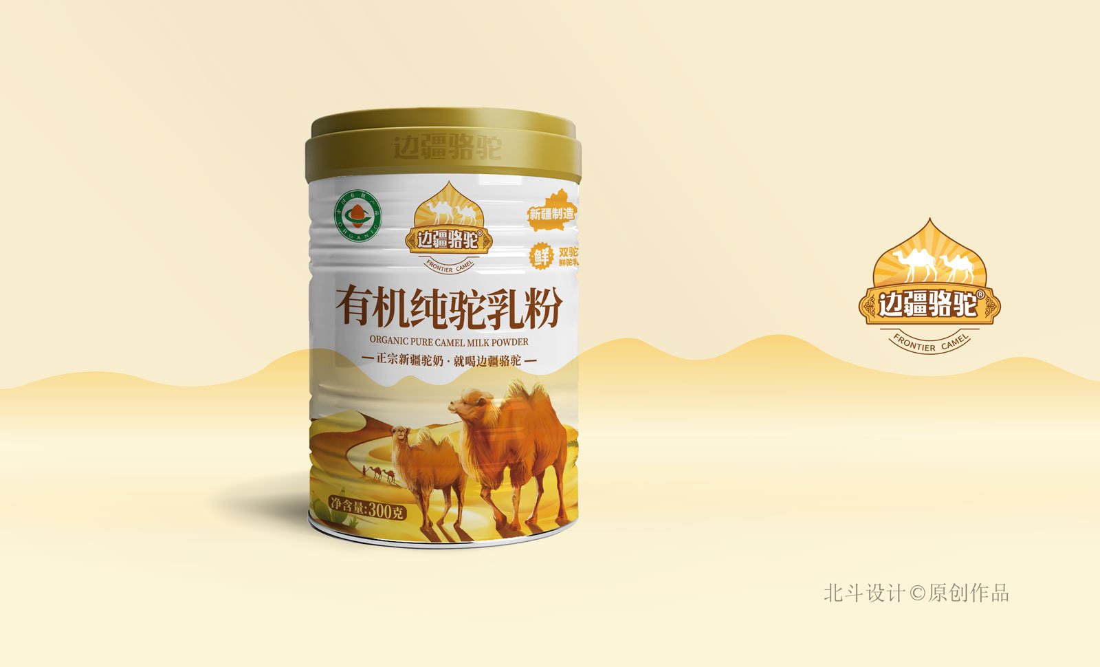 logo設(shè)計(jì),我們借用了新疆的符號(hào)作為邊框的表現(xiàn),通過符號(hào)去關(guān)聯(lián)品牌名字,這樣更能夠?qū)⑵放频囊曈X特點(diǎn)表現(xiàn)出來。包裝設(shè)計(jì)方面,我們采用了手繪沙漠與駱駝的場景表現(xiàn),讓用戶一眼就能識(shí)別出這是一款駝乳粉。