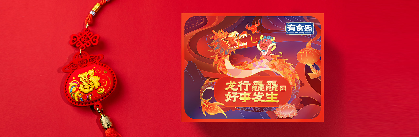 紅紅火火,是中國的過年氛圍,所有的禮盒視覺都繞不開中國紅的氛圍設(shè)計(jì)。此次北斗設(shè)計(jì)為有食炁設(shè)計(jì)的龍年禮盒同樣是采用了中國為主色調(diào),但是我們?nèi)谌肓爽F(xiàn)代的藍(lán)色系,讓整體的色點(diǎn)偏一點(diǎn)冷調(diào),使整體畫面視覺變得時(shí)尚且更有活力。