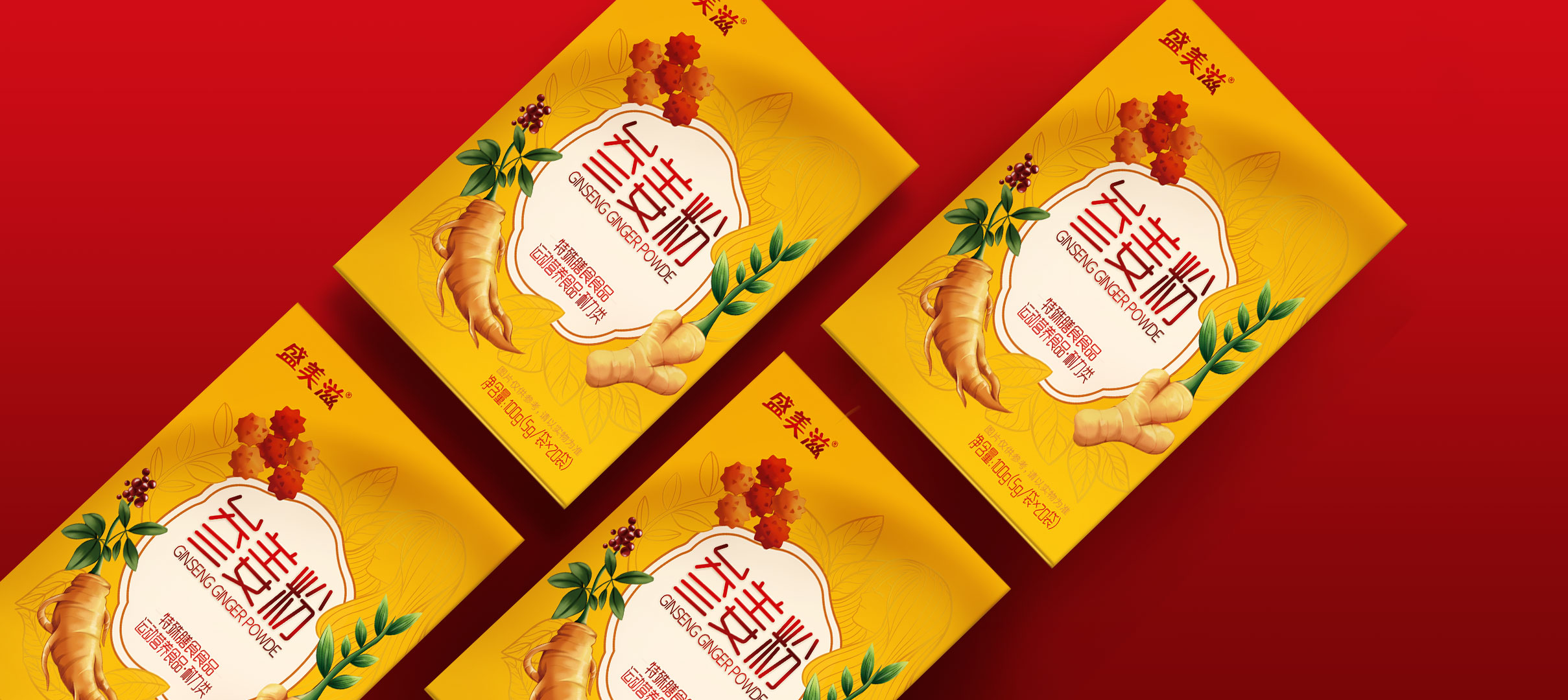 從色彩上就能感知到產(chǎn)品所帶給用戶的溫度感,這款參姜粉包裝設(shè)計(jì)最成功的地方在與色彩的選用,暖黃色搭配白色,結(jié)合產(chǎn)品手繪元素,帶給用戶功能屬性與產(chǎn)品屬性的直觀傳達(dá)。