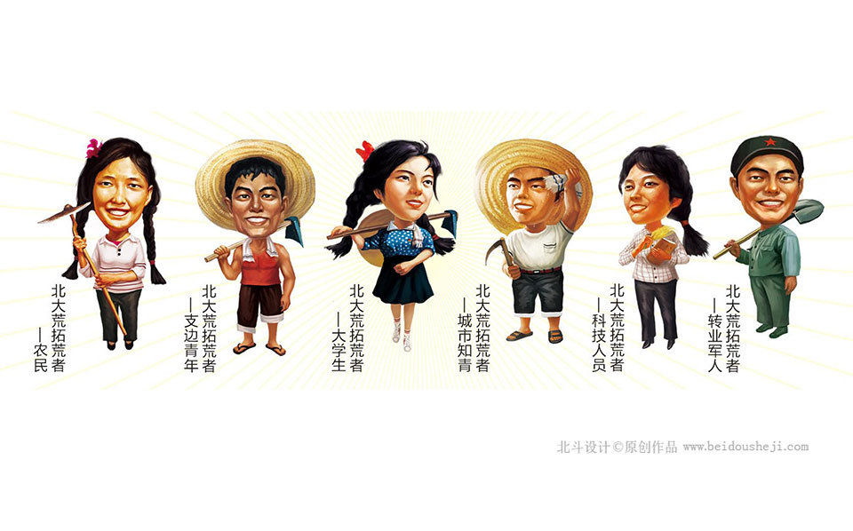 用卡通ip創(chuàng)意去為每一個代表拓荒者塑造一個形象,展示出當(dāng)時拓荒者:艱苦奮斗,勇于開拓,顧全大局,無私奉獻(xiàn)的北大荒精神。