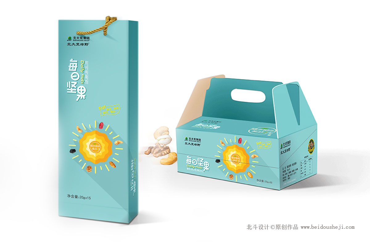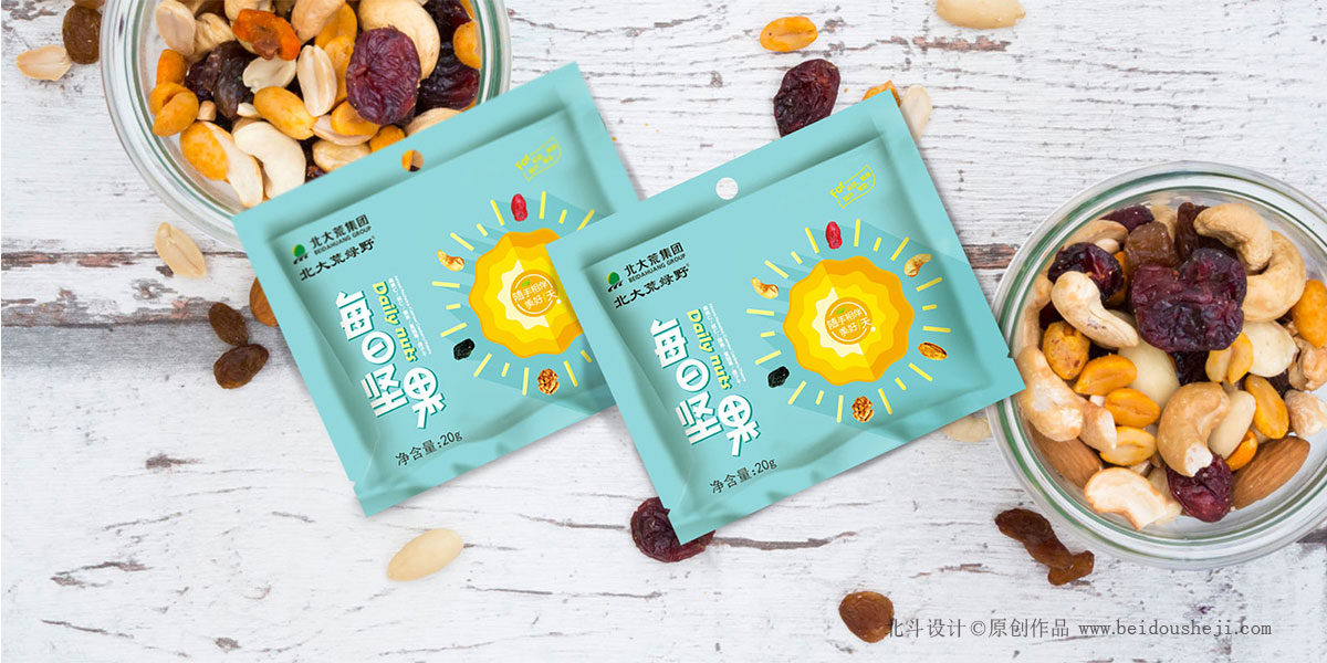 在這次的堅(jiān)果包裝設(shè)計(jì)上,北斗品牌設(shè)計(jì)根據(jù)每日?qǐng)?jiān)果的品牌定位提煉了品牌的包裝視覺符號(hào)——太陽(yáng)。
