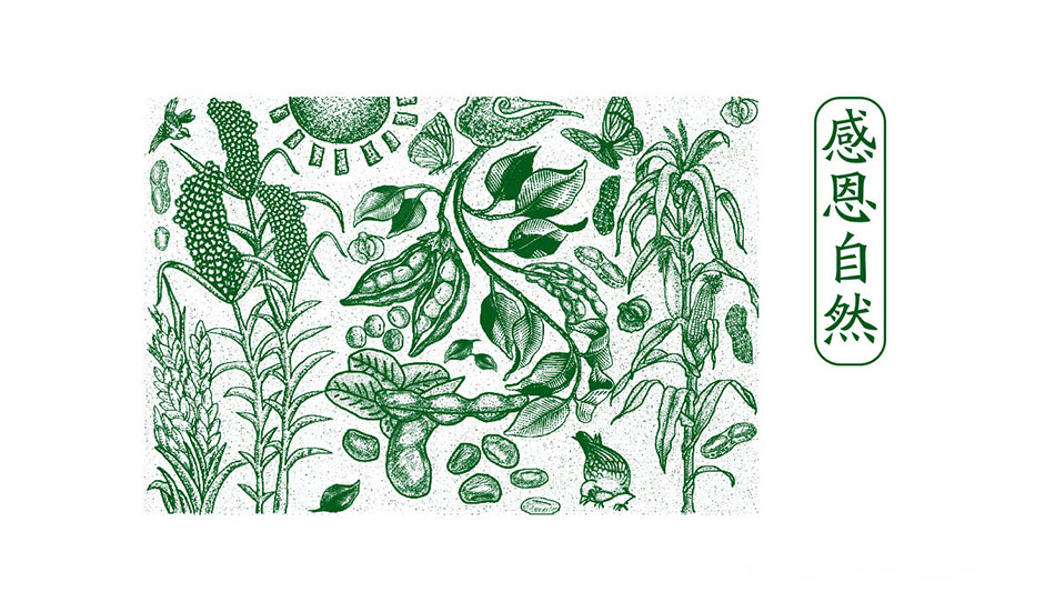 從品牌的視覺上相成品牌設(shè)計運(yùn)用了插畫的表現(xiàn)風(fēng)格來表現(xiàn)五谷禮贊,感恩自然的主題。然后再通過合理的版面設(shè)計,讓整體的包裝設(shè)計達(dá)成和諧統(tǒng)一。