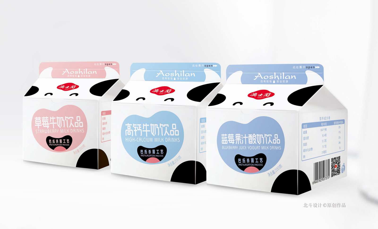 針對澳士蘭卡通版包裝設計項目,北斗設計策略:運用奶牛作為產(chǎn)品元素表現(xiàn),讓消費者直觀感受到到產(chǎn)品的屬性。顏色運用在整個澳士蘭包裝設計體系里取用,主題是:清新,簡潔,體現(xiàn)出“鮮”的概念。客戶反饋:澳士蘭楊總見到這次的包裝系統(tǒng)升級升級給出了高度的肯定,對于這個系列的屋頂盒設計方案非常興奮的說:太可愛了,我太喜歡了。 我想這就是我們要表達,我們期望我們的作品能夠傳遞給我們的用戶一種愉悅的心情,我們在享受的過程,能感覺到它給我們帶來趣味與健康,讓我們優(yōu)雅的體驗一個有創(chuàng)意的作品。