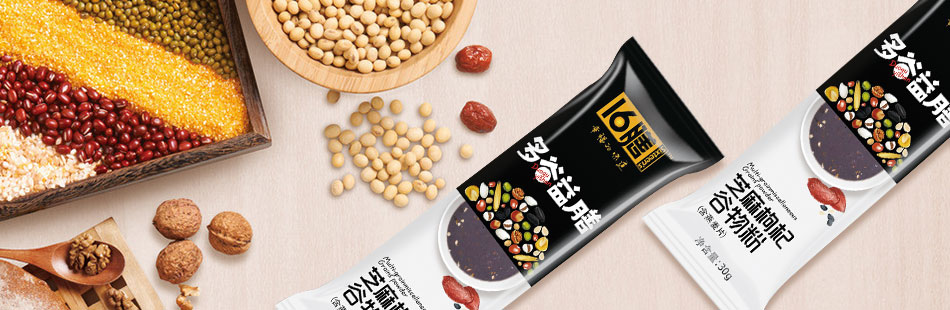 十六膳的多谷益膳系列通過前期的市場終端考察研究,分析,我們幫助其定制了“一正一負的獨特板式”作為其品牌記憶符號。同樣是紙盒和鋁箔袋,只要大家看到這種一正一負的包裝形式,就能無形想到這就是十六膳的多谷益膳系列包裝形象。