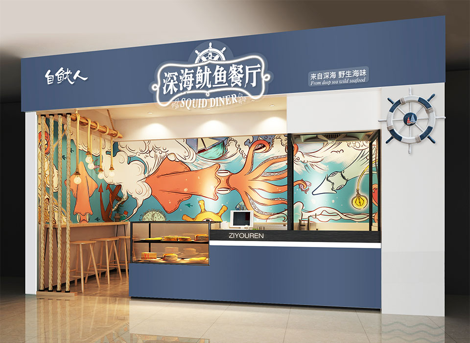 北斗設(shè)計(jì)通過(guò)對(duì)于自由人的戰(zhàn)略定位分析,要想在10-20平方米的空間去設(shè)計(jì)有個(gè)性的體驗(yàn)空間,必須找到一個(gè)合適的主題插畫,那么這份插畫的表現(xiàn)內(nèi)容,表現(xiàn)風(fēng)格到底是怎樣的?這個(gè)需要北斗設(shè)計(jì)團(tuán)隊(duì)的策略定位。首先我們第一步思考的是:自由人的這個(gè)體驗(yàn)空間是解決什么樣的需求,需要塑造什么要的視覺體驗(yàn)?帶著問(wèn)題我們與自由人的李總,市場(chǎng)總監(jiān)等合伙人進(jìn)行深度溝通,此次自魷人的這個(gè)店面升級(jí),主要是自魷人的一個(gè)模式升級(jí),希望通過(guò)自魷人的品牌效應(yīng)改變產(chǎn)品線的延展,給到用戶更具有創(chuàng)新的美食體驗(yàn)。希望通過(guò)海產(chǎn)品帶動(dòng)快餐,解決快速便捷的休閑餐飲的問(wèn)題。