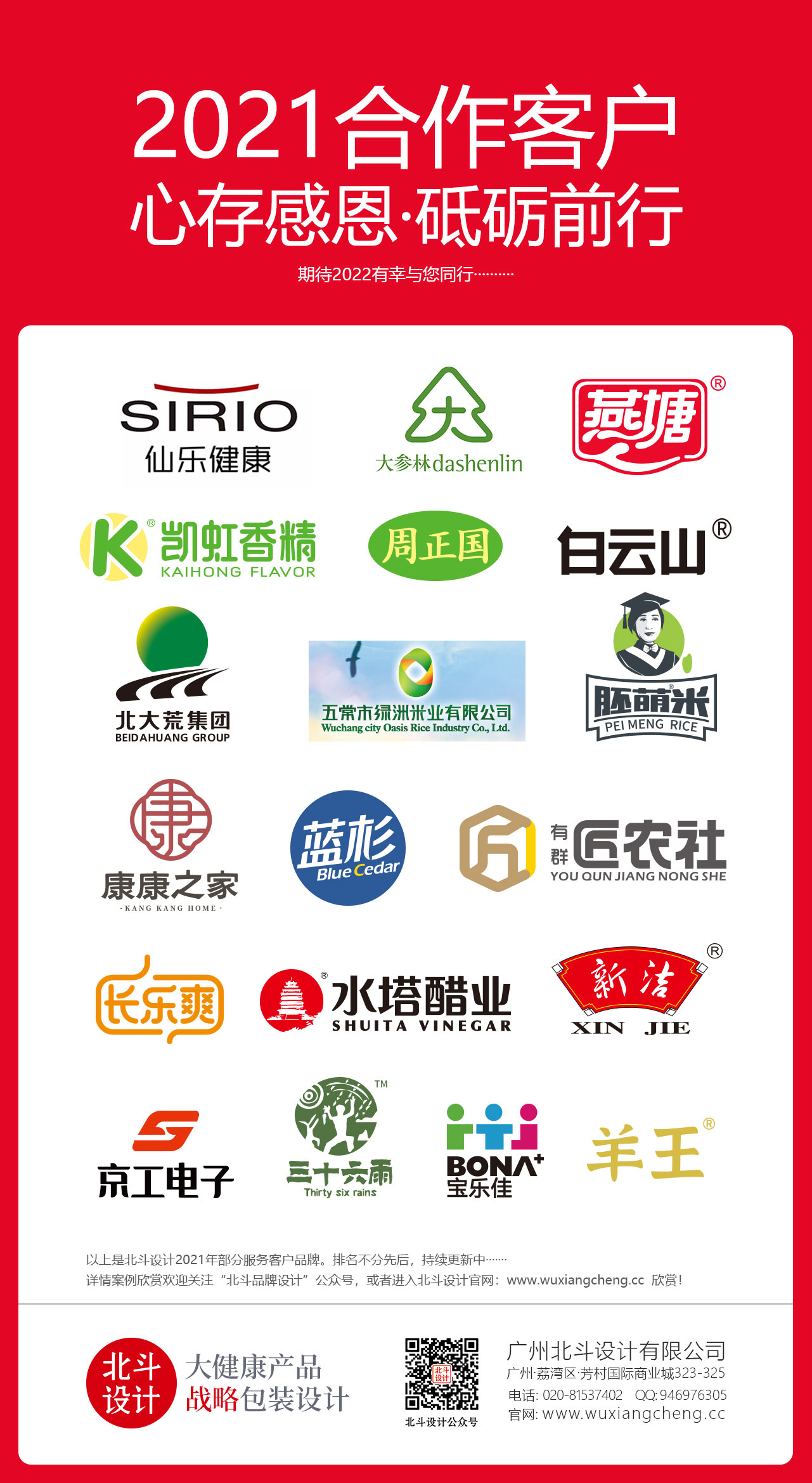 2021是值得感恩的一年,北斗設(shè)計從以往的一年服務(wù)幾十個客戶,慢慢減少為20個左右,而這20個客戶并非是說很大的客戶,像匠農(nóng)社這個客戶原本是我們從成立到現(xiàn)在一直非常信任及支持我們的客戶,是我們非常優(yōu)質(zhì)的客戶,而北大荒,寶樂佳等客戶是我們合作5年以上的客戶。今年也新進(jìn)了幾個優(yōu)質(zhì)的客戶,比如大森林,白云山,三十六雨,凱虹香精等。在此非常感謝每個客戶對于北斗設(shè)計的支持與信任,是你們的信任讓我們的合作得以保持愉悅。期望我們2022年繼續(xù)保持熱愛,共赴山海,感恩!#北斗設(shè)計