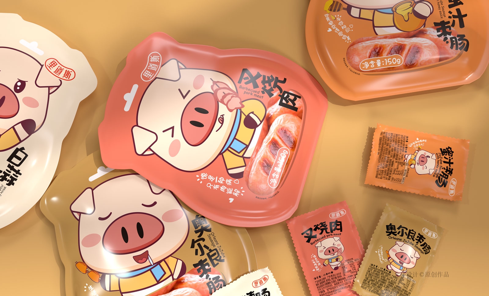 解決產(chǎn)品文案排列,接下里來(lái)就是產(chǎn)品的包裝視覺(jué)策劃。這里我們?yōu)槠湓O(shè)計(jì)了一個(gè)卡通ip角色,命名為秋林豬豬,通過(guò)ip角色的創(chuàng)意,快速解決產(chǎn)品包裝的同質(zhì)化的問(wèn)題,同時(shí)帶給目標(biāo)用戶更為愉悅的體驗(yàn)感。