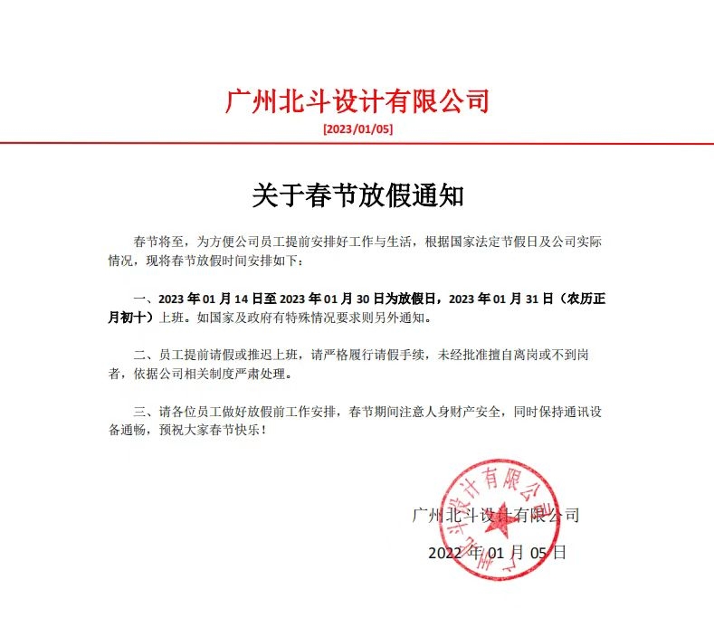 2023春節(jié)將至,為方便員工及客戶更好安排工作,北斗設(shè)計公司現(xiàn)將春節(jié)放假時間公告如下,希望所有同事與我們的客戶對接到位,交接好所有放假前的工作,避免給客戶及公司造成工作上的失誤,在此提前祝賀大家,春節(jié)快樂,新的一年,事事順心如意,工作家庭幸福和諧。謝謝大家!