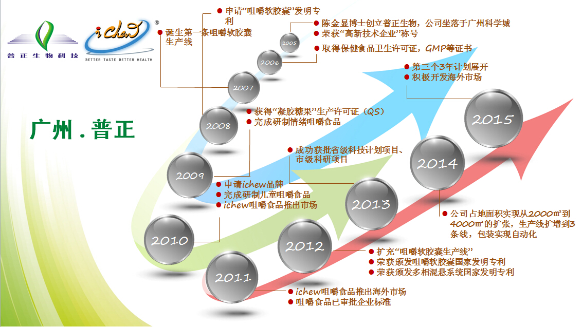 廣州普正生物科技有限公司由陳金顯博士于2005年創(chuàng)立,是一家致力研究、開(kāi)發(fā)、生產(chǎn)和銷售“美味健康食品”的高新技術(shù)外資企業(yè)。公司秉承“普澤中正”的經(jīng)營(yíng)理念,以品質(zhì)為基石,以創(chuàng)新為動(dòng)力,我們力求“色、香、味、效,一個(gè)都不能少”;我們致力成為全球健康食品行業(yè)的佼佼者,為健康食品領(lǐng)域創(chuàng)造價(jià)值、開(kāi)拓未來(lái)!咀嚼軟膠囊研制專家