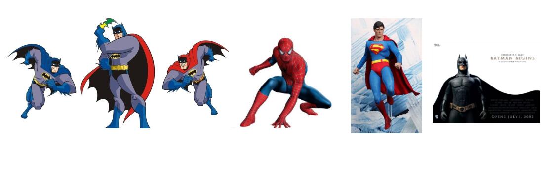 這些超級(jí)英雄人物明顯的外形特點(diǎn):內(nèi)褲外穿,帥氣的披風(fēng),胸前一個(gè)標(biāo)志性的圖案。