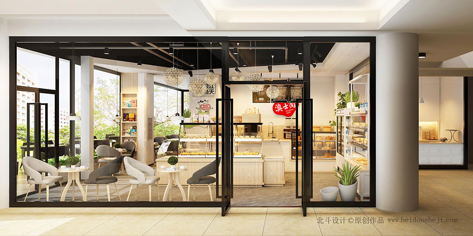 再看里面的裱花間及大廈大廳里的視覺效果。這里面完全透明。目的是為了讓進入大廈的消費者能夠更好的體驗澳士蘭的店面景觀形象。裱花間的設計更是精致無別。消費者還可以親自站在外面清晰的看到師傅的手工藝。