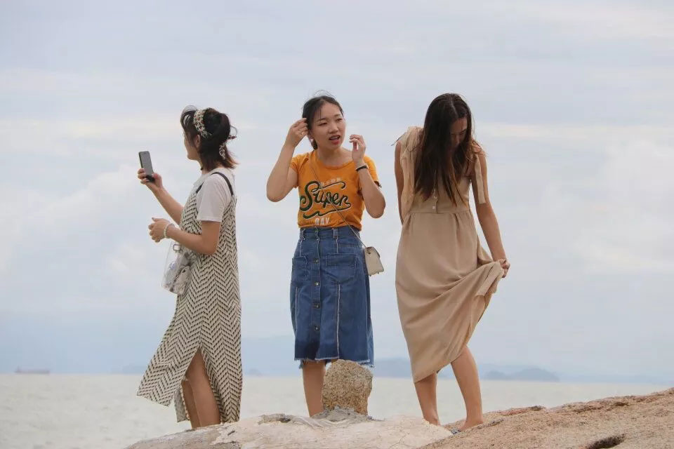 接著大新又組織我們包快艇環(huán)島玩坐著快艇,登上快艇,我們就向我們的目的地出發(fā)了,海面碧波蕩漾,在陽光下波光粼粼,快艇激起的浪花飛快向后灑去,就好像是不小心撕裂了上好的碧綠綢緞,讓里面裝著的珍珠都灑了出來。乘風(fēng)破浪,咸咸的帶著濕氣的海風(fēng)吹在臉上,揚(yáng)起了我們的頭發(fā),好不愜意??焱Лh(huán)島有三個(gè)瀏覽地,第一個(gè)是烏龜山,山的形狀像一只烏龜,名字由此而來,據(jù)說烏龜山還寓意著長壽、吉祥,但是不可上島,我們乘快艇環(huán)島一周就過去了。然后我們就到了第二座小島——美人魚島,我們登上小島,小島上都是礁石組成的,不少游客攀爬著礁石,在上面擺著各種各樣的姿勢,爭奇斗艷,要我看,也許是想做美人魚島上的那個(gè)美人吧~我們也不例外,從這塊石頭攀爬到另一塊石頭,明明下面就是深不可測的大海,卻絲毫不退縮。