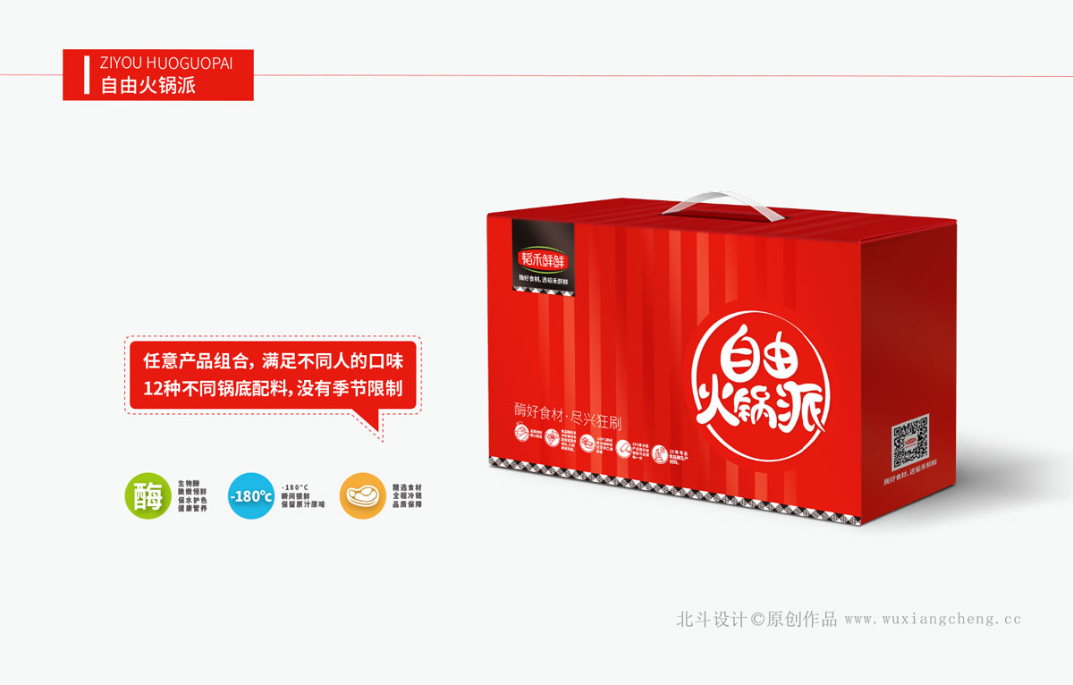 針對(duì)不同的產(chǎn)品組合我們規(guī)劃了禮盒的包裝設(shè)計(jì),解決不同人數(shù),不同場(chǎng)景搭配不同食量的火鍋套餐選擇,幫助消費(fèi)者快速購(gòu)買到合適自己的套餐產(chǎn)品。比如兩個(gè)人想一起打火鍋,我們會(huì)建議您選擇兩人的搭配套餐。北斗設(shè)計(jì)將此系列產(chǎn)品命名為:《自由火鍋派》。