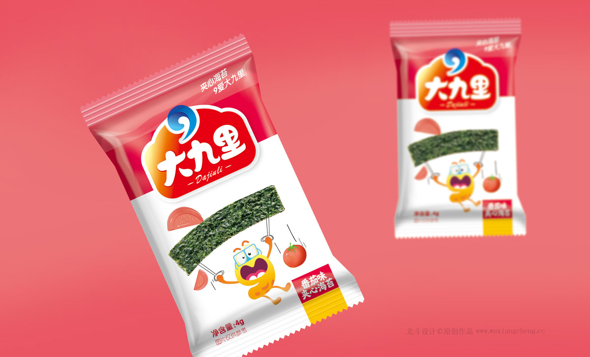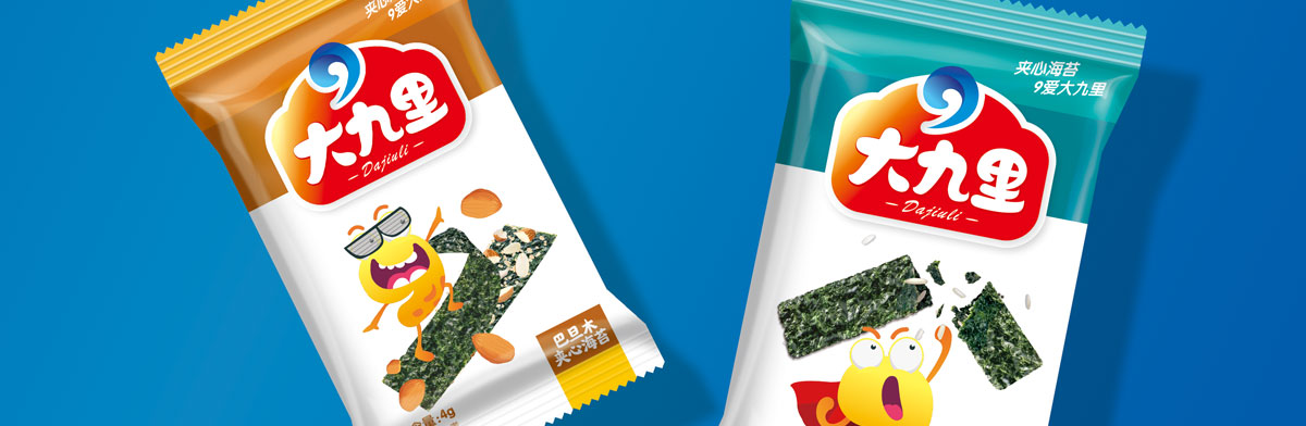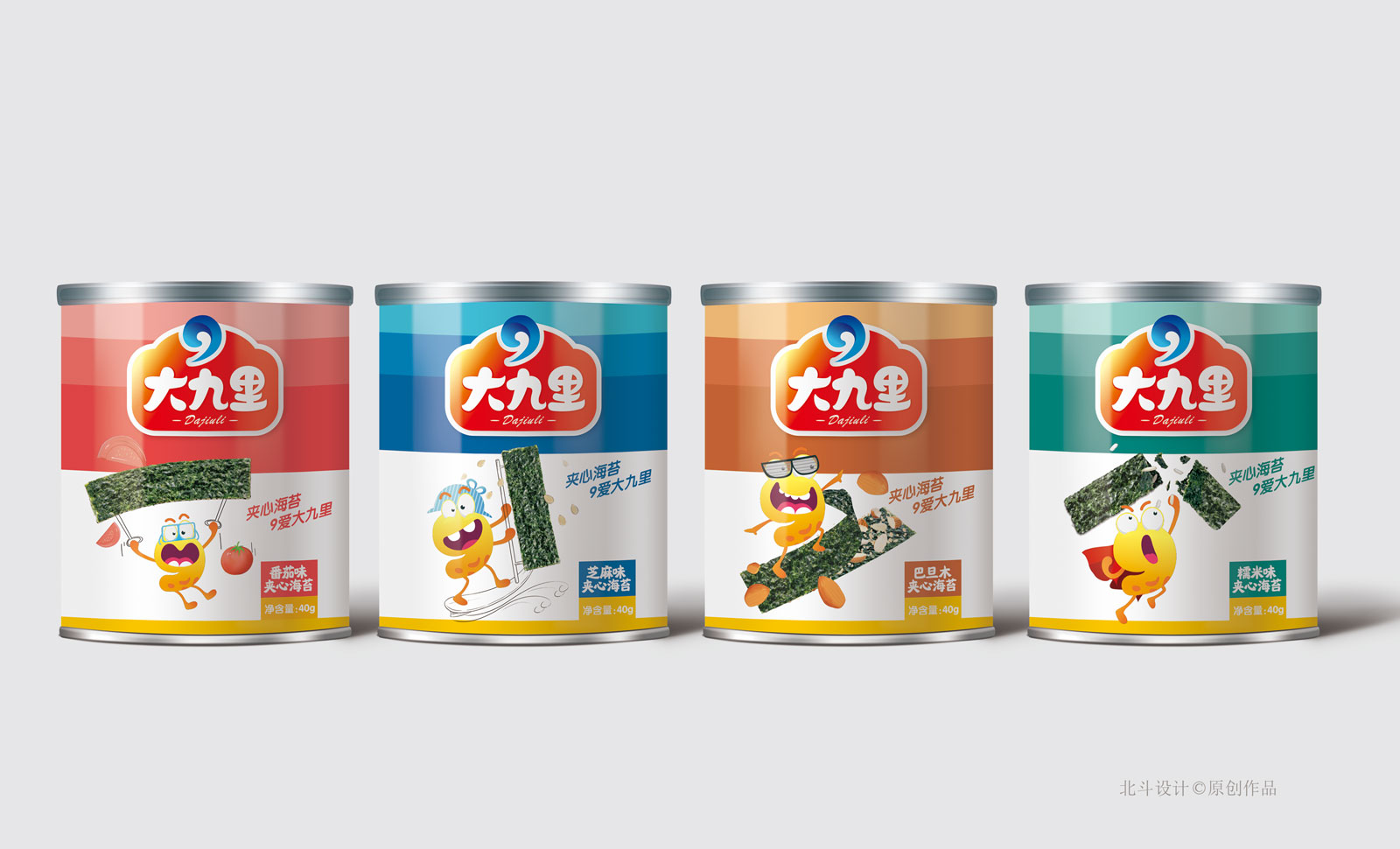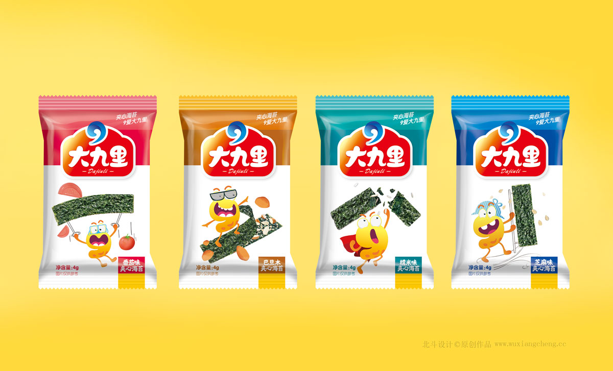 第三:產(chǎn)品包裝設(shè)計的色彩學(xué)。色彩是產(chǎn)品包裝設(shè)計非常重要的一部分,人們在關(guān)注任何一個產(chǎn)品包裝時,首先被他吸引的是色彩,產(chǎn)品包裝設(shè)計的色彩一般結(jié)合產(chǎn)品屬性及品牌形象定位來取用,大九里夾心系列海苔包裝設(shè)計,色彩選用是根據(jù)的是產(chǎn)品的口味屬性來取用。