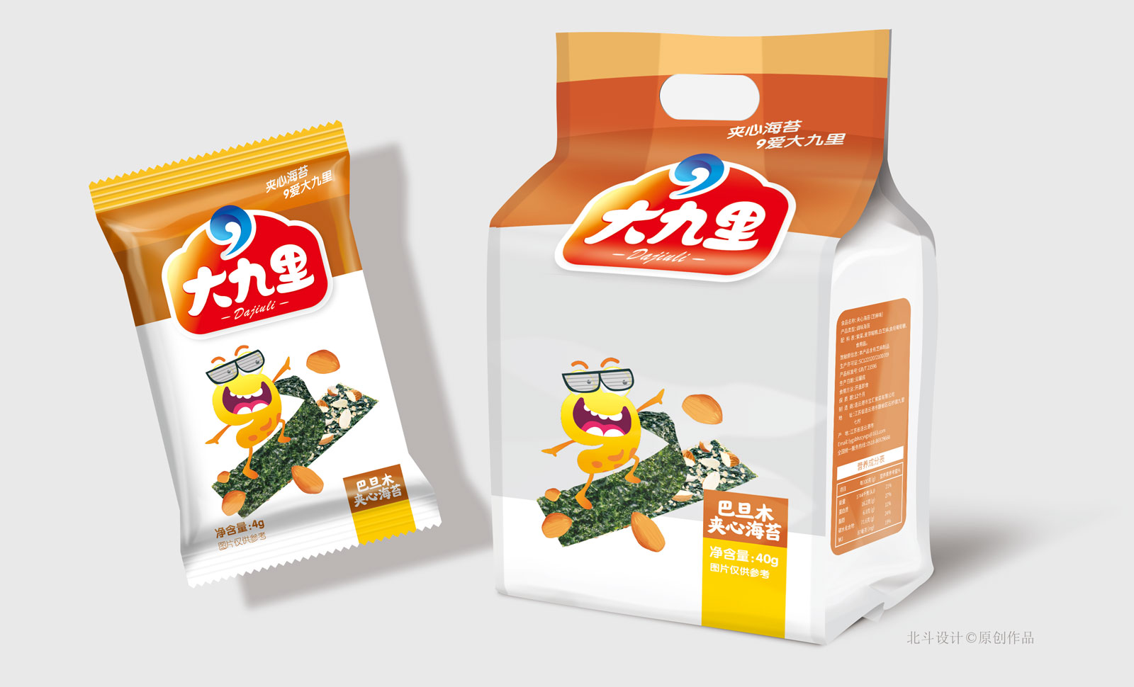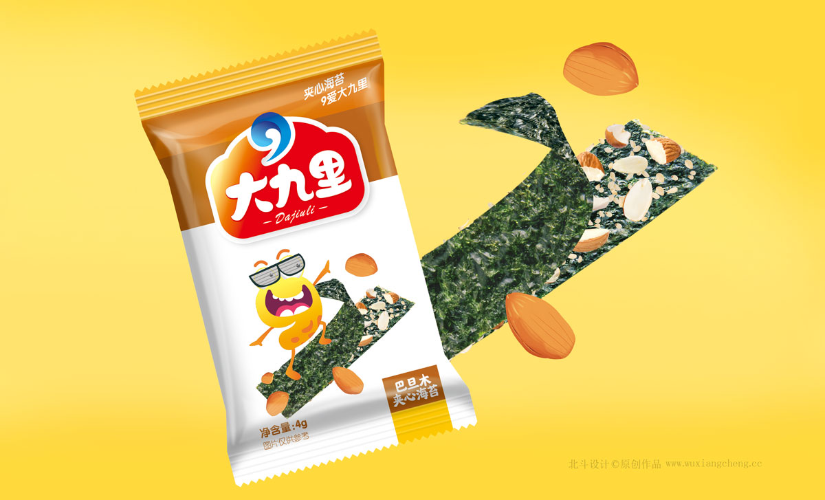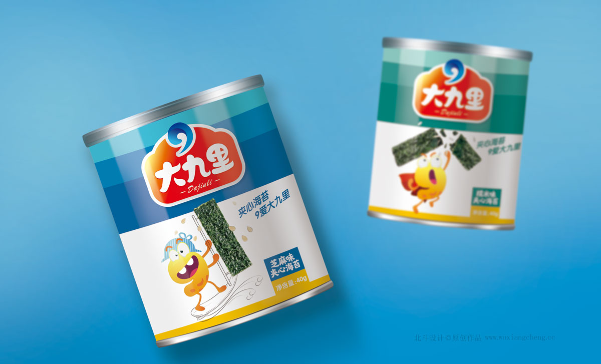 第三:產(chǎn)品包裝設(shè)計的色彩學(xué)。色彩是產(chǎn)品包裝設(shè)計非常重要的一部分,人們在關(guān)注任何一個產(chǎn)品包裝時,首先被他吸引的是色彩,產(chǎn)品包裝設(shè)計的色彩一般結(jié)合產(chǎn)品屬性及品牌形象定位來取用,大九里夾心系列海苔包裝設(shè)計,色彩選用是根據(jù)的是產(chǎn)品的口味屬性來取用。