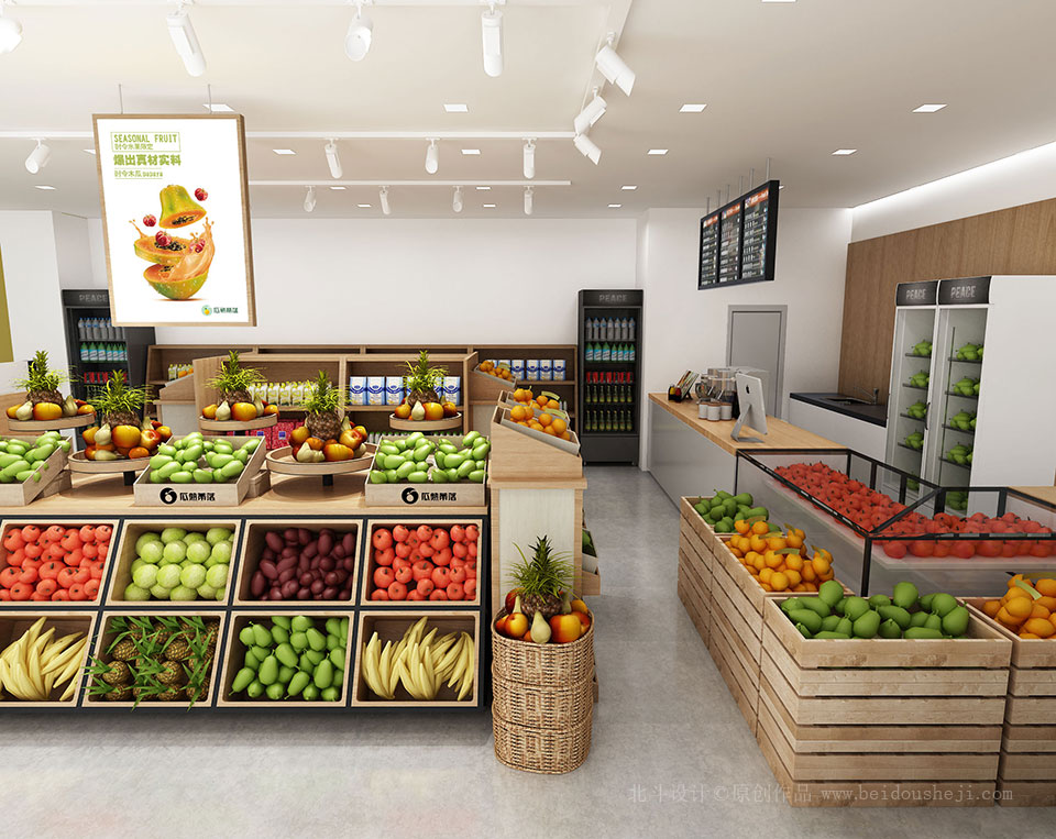 北斗設(shè)計(jì)幫助瓜熟蒂落營(yíng)造的是一種現(xiàn)代風(fēng)格水果體驗(yàn)館。主要功能布局:1.瓜熟蒂落精選水果區(qū)、2.農(nóng)創(chuàng)交流區(qū)、3.進(jìn)口產(chǎn)品區(qū)、4.時(shí)令水果區(qū)。