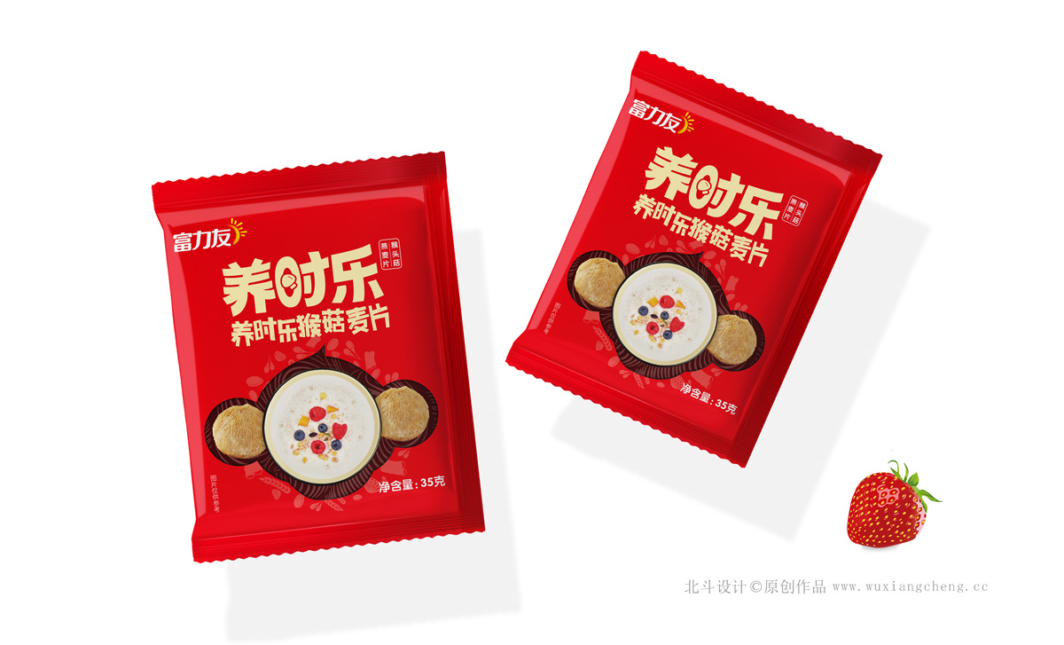 富力友的麥片包裝策劃設(shè)計運(yùn)用了標(biāo)準(zhǔn)紅色系,紅色在節(jié)日豐富的中國市場上是最受歡迎的色系。包裝記憶符號延續(xù)了上面猴頭菇餅干系列的“猴頭”記憶符號,這兩款產(chǎn)品從銷售戰(zhàn)略上,也是屬于搭配產(chǎn)品,符合系列產(chǎn)品延展的策略。