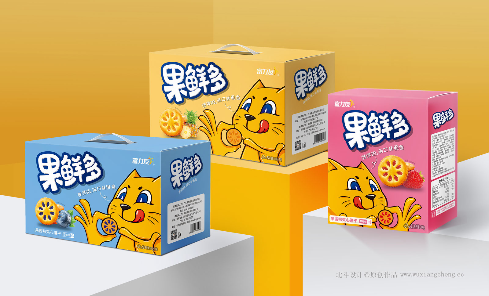 貓作為動物里比較挑食的種類,這是大家對于貓的共性認(rèn)知,所以我們想到了饞貓的ip文化,借助饞貓的概念能夠讓大家迅速記住富力友果鮮多的包裝設(shè)計形象,同時能體現(xiàn)果鮮多的美味。