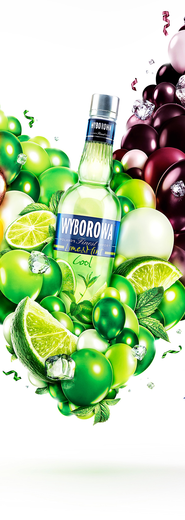 這組食品海報(bào)的創(chuàng)意挑戰(zhàn)在于背景元素的制作,通過(guò)3d建模渲染出靚麗的氣球元素和水果元素,通過(guò)兩者的結(jié)合擺出以一組動(dòng)感的構(gòu)圖,從而體現(xiàn)了WYBOROWA的年輕時(shí)尚的概念。