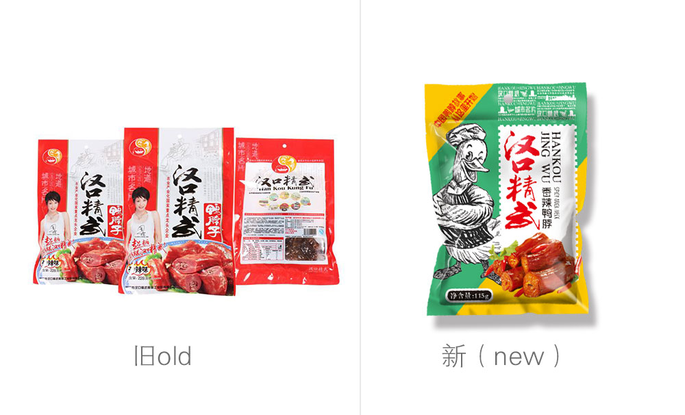 比如我們在升級漢口精武品牌產(chǎn)品包裝設(shè)計時,首先我們從產(chǎn)品的食欲感,還有產(chǎn)品的代言人上去做創(chuàng)新,為了讓消費者能夠快速的接受漢口精武的包裝創(chuàng)新改造,我們首先是保留了漢口精武傳承20多年不變的品牌書法字體,這個是一筆資產(chǎn),然后我們再從品牌的運營成本上去思考,之前聘用了代言人,現(xiàn)在不用了,我們原創(chuàng)了一只鴨子作為品牌文化ip來塑造,鴨子的屬性和性格在這類產(chǎn)品上能夠快速的被認可。