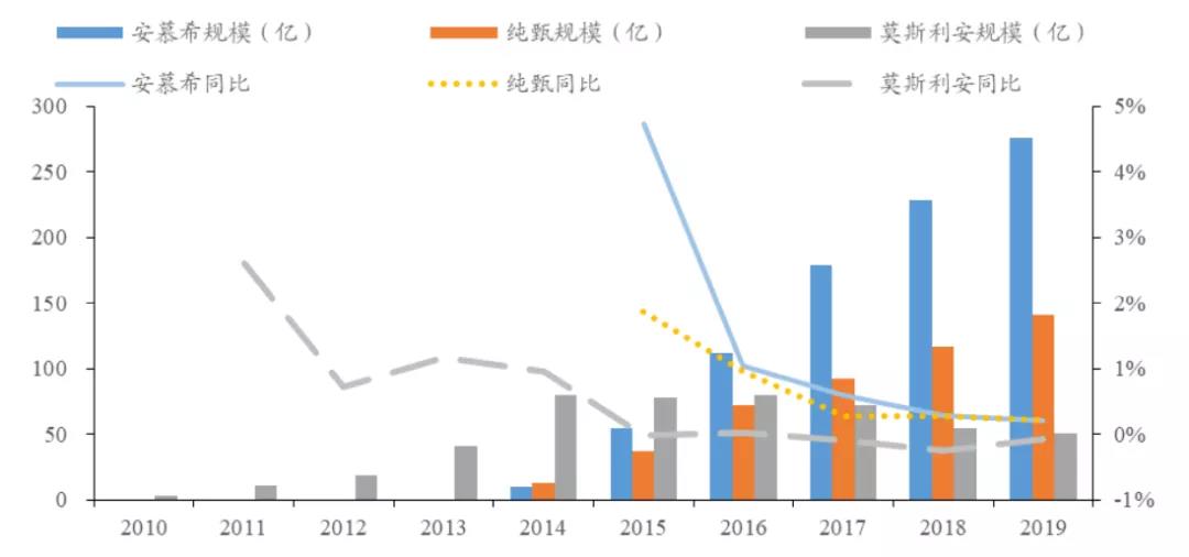 2014年之前,莫斯利安幾乎壟斷了國內的常溫酸奶市場,銷售額從2009年的1.6億猛增至2014年的79.3億。但伊利和蒙牛先后推出“安慕希”和“純甄”,殺進常溫酸奶領域,讓莫斯利安的增長勢頭在2015年戛然而止,并陷入到持續(xù)下滑的困境之中。