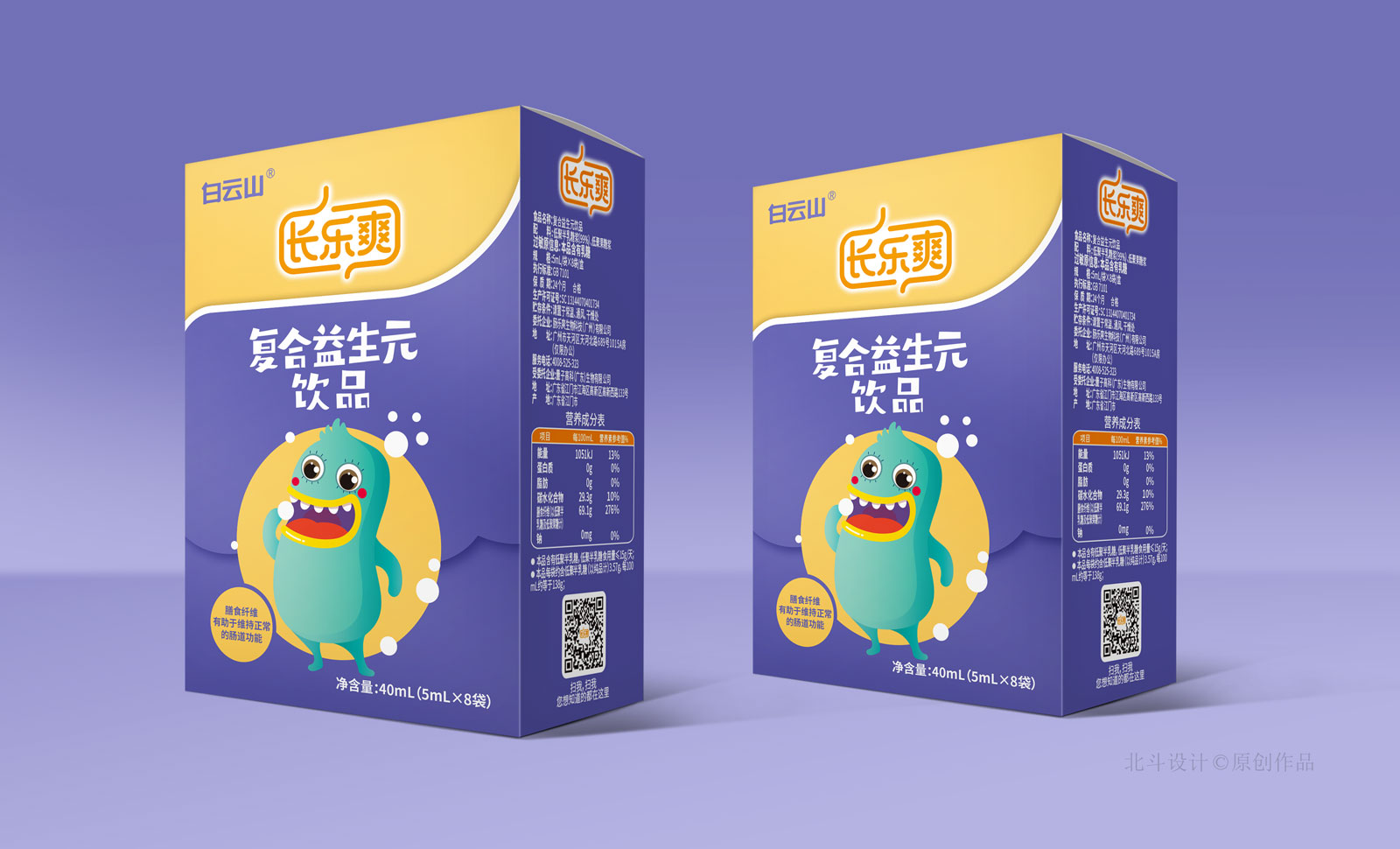 這是北斗包裝設(shè)計(jì)理念核心之一:產(chǎn)品包裝設(shè)計(jì)必須直觀明了展現(xiàn)產(chǎn)品,不能讓消費(fèi)者看半天,不知道您賣(mài)的是什么?能做到第一眼識(shí)別認(rèn)知,就不要留著等看說(shuō)明書(shū)才明白。創(chuàng)意的目的是為了讓體驗(yàn)更加直觀明了,同時(shí)讓審美更加美好。所以我們直接強(qiáng)化:長(zhǎng)樂(lè)爽益生元,或者是強(qiáng)調(diào)益生元飲品