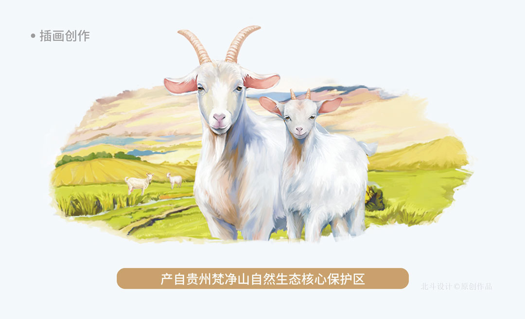 北斗設(shè)計通過清新的油畫風(fēng)格,刻畫出山羊細膩而溫馨的畫面感,結(jié)合大面積的白色系,整體的包裝視覺呈現(xiàn)出一種小清新的品質(zhì)感,帶給用戶一種生態(tài),安全的信任感。