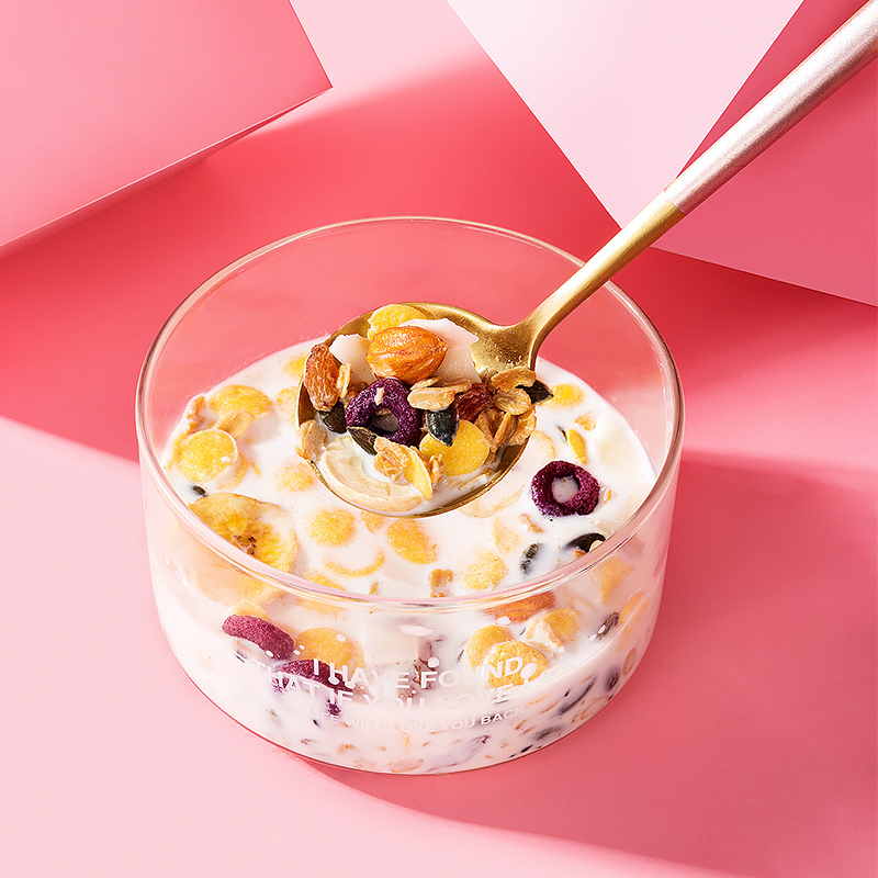 所以這里我們抓住了產(chǎn)品本身的特色,谷物與堅(jiān)果的搭配是這款酸奶的特色,我們把谷物水果作為產(chǎn)品最直觀的表現(xiàn)!再搭配一種較為時(shí)尚的橙黃色作為主調(diào)。同時(shí)在杯底做了一個(gè)牛奶波動(dòng)圖形的分割,使得一個(gè)小小的杯子靈動(dòng)起來,讓這個(gè)方案顯得更有食感與品質(zhì)感。這就是方案一的整體思維,認(rèn)知+美學(xué),帶給用戶更美好的視覺體驗(yàn)。