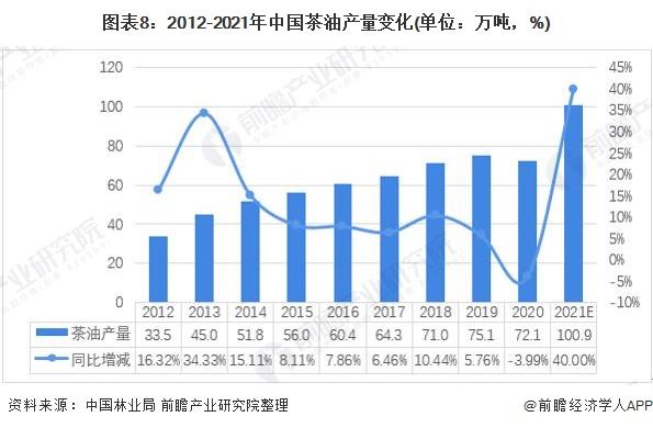 近年來,中國油茶高產(chǎn)高效加工機械設(shè)備也不斷升級,茶籽出油率目前可達25%,較2013年前提高了5個百分點。茶籽出油率不斷提高,油茶籽產(chǎn)量也在逐年上升,中國茶油的產(chǎn)量自然也在飛速地增長。根據(jù)中國林業(yè)局發(fā)布的數(shù)據(jù)來看,2020年中國茶油產(chǎn)量受到疫情的影響,在72.1萬噸左右,同比下降3.99%。根據(jù)國家林業(yè)局發(fā)布的公告,2021年中國茶油產(chǎn)量增長達到40%,約100.9萬噸。