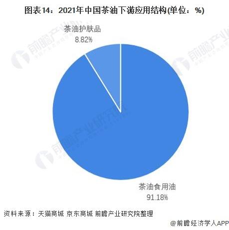 目前在各大購物平臺以“茶油”為關(guān)鍵詞搜索出現(xiàn)的商品分類基本只有寥寥幾種。如天貓商城中顯示的分類為“食用油”和“護膚按摩油”,京東商城中顯示的分類為“食用油”、“寶寶護膚”、“油”和“米面調(diào)味”。由此可見,目前市面上流通的茶油商品中,最主要的就是食用油和護膚品。其中,作為食用油的茶油產(chǎn)品占到了約91.18%,而作為護膚品的茶油僅占8.82%??梢娔壳爸袊栌拖掠螒?yīng)用結(jié)構(gòu)仍舊較為單一。