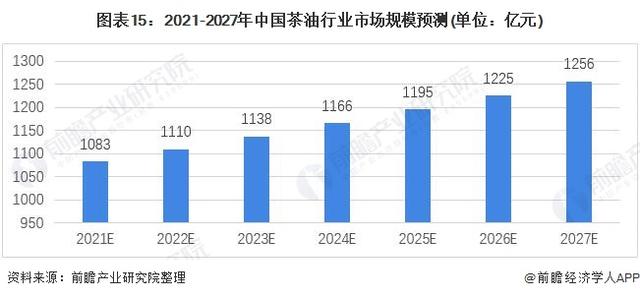 據(jù)前瞻產(chǎn)業(yè)研究院根據(jù)茶油近幾年的發(fā)展規(guī)模以及將來的發(fā)展趨勢測算,結(jié)合林業(yè)局對于近年來中國茶油發(fā)展增速的預(yù)測,前瞻認為2021-2027年中國茶油市場規(guī)模將以約2.4%的增速進行復(fù)合增長,到2027年,中國茶油行業(yè)市場規(guī)模將超過1250億元。
