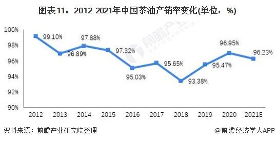從2012-2021年茶油的產(chǎn)量與需求量變化中可以看出,當前中國的茶油產(chǎn)量已經(jīng)能夠滿足中國茶油的需求量,可以看到,中國茶油的產(chǎn)銷率自2018年來總體呈現(xiàn)上漲的趨勢,2020年,中國的茶油產(chǎn)銷率為96.98%,2021年預(yù)計為96.23%。