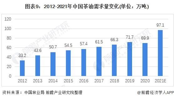 近年來人民生活水平的不斷提高、植物油等健康食用油越來越受到重視等因素都為茶油行業(yè)帶來了源源不斷的市場需求。2020年中國茶油的的需求量受疫情的影響出現(xiàn)下降,預(yù)計2021年需求量將迎來較為明顯的增長,達到97.1萬噸。