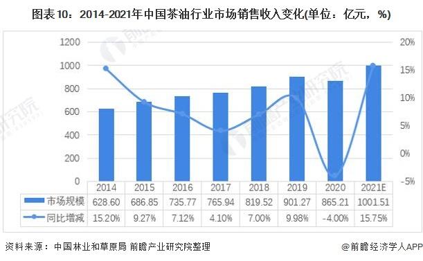 近年來,中國加大對茶油行業(yè)的扶持力度,在市場需求攀升及政策利好形勢下,油茶種植面積呈現(xiàn)平穩(wěn)上升趨勢,茶油行業(yè)市場規(guī)模也逐漸擴大。2020年受到疫情的影響,供給和需求端都出現(xiàn)了下滑的態(tài)勢,市場銷售收入下滑到865.21億元,根據(jù)國家林業(yè)局發(fā)布的數(shù)據(jù),2021年中國茶葉市場銷售收入已經(jīng)超過1000億元,同比增長15.75%。