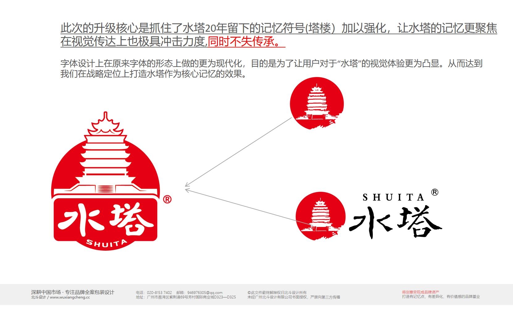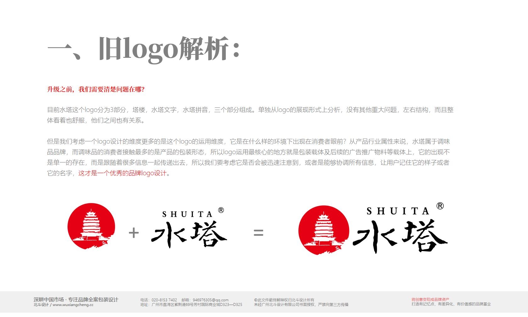 但是我們考慮一個logo設(shè)計的維度更多的是這個logo的運(yùn)用維度,它是在什么樣的環(huán)境下出現(xiàn)在消費(fèi)者眼前?從產(chǎn)品行業(yè)屬性來說,水塔屬于調(diào)味品品牌,而調(diào)味品的消費(fèi)者接觸最多的是產(chǎn)品的包裝形態(tài),所以logo運(yùn)用最核心的地方就是包裝載體及后續(xù)的廣告推廣物料等載體上,它的出現(xiàn)不是單一的存在,而是跟隨著很多信息一起傳遞出去,所以我們要考慮它是否會被迅速注意到,或者是能夠協(xié)調(diào)所有信息,讓用戶記住它的樣子或者它的名字,這才是一個優(yōu)秀的品牌logo設(shè)計。
