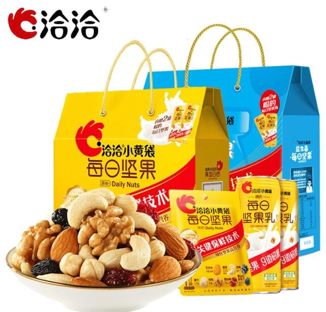 尤其在藍(lán)色包裝上掛一個小藍(lán)袋,更想是強加的“掛羊頭賣狗肉”,我第一次看到這個包裝的時候就特別不舒服。同時禮盒設(shè)計也是一樣,為了跟隨洽洽的換色系,在藍(lán)色禮盒上做了一塊大大的黃色,對比是有了,品牌關(guān)聯(lián)是有了,但是你有想過美學(xué)體驗感嗎?你可能會說,管它呢?賣貨最重要,我只能說你說的對,但是物質(zhì)與精神文化是我們這個時代的消費者應(yīng)該享受的。