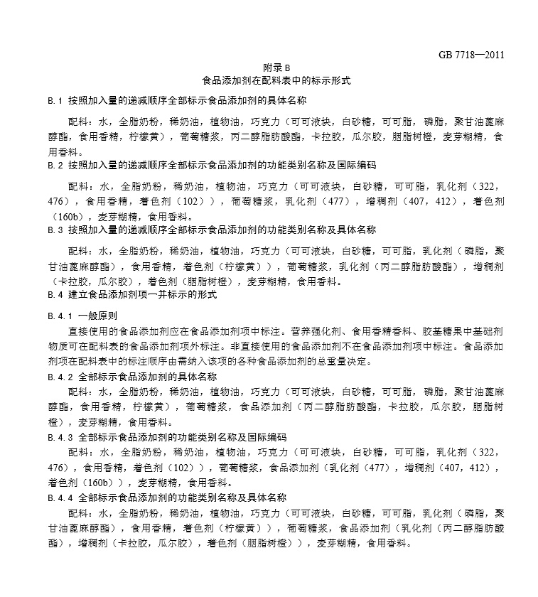 種復合配料已有國家標準、行業(yè)標準或地方標準,且其加入量小于食品總量的25%時,不需要標示復合 配料的原始配料。 4.1.3.1.4食品添加劑應當標示其在GB 2760中的食品添加劑通用名稱。食品添加劑通用名稱可以標示為 食品添加劑的具體名稱,也可標示為食品添加劑的功能類別名稱并同時標示食品添加劑的具體名稱或國 際編碼(INS號)(標示形式見附錄B)。在同一預包裝食品的標簽上,應選擇附錄B中的一種形式標示 食品添加劑。當采用同時標示食品添加劑的功能類別名稱和國際編碼的形式時,若某種食品添加劑尚不 存在相應的國際編碼,或因致敏物質標示需要,可以標示其具體名稱。食品添加劑的名稱不包括其制 法。加入量小于食品總量25%的復合配料中含有的食品添加劑,若符合GB 2760規(guī)定的帶入原則且在最 終產(chǎn)品中不起工藝作用的,不需要標示。 4.1.3.1.5在食品制造或加工過程中,加入的水應在配料表中標示。在加工過程中已揮發(fā)的水或其他揮發(fā) 性配料不需要標示。 4.1.3.1.6可食用的包裝物也應在配料表中標示原始配料,國家另有法律法規(guī)規(guī)定的除外。 4.1.3.2