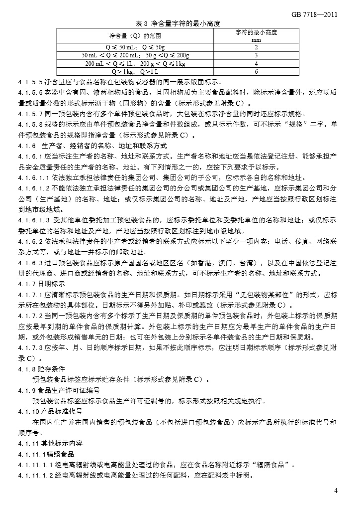 本標準代替GB 7718-2004《預包裝食品標簽通則》。 本標準與GB 7718-2004相比,主要變化如下: ——修改了適用范圍; ——修改了預包裝食品和生產(chǎn)日期的定義,增加了規(guī)格的定義,取消了保存期的定義; ——修改了食品添加劑的標示方式; ——增加了規(guī)格的標示方式; ——修改了生產(chǎn)者、經(jīng)銷者的名稱、地址和聯(lián)系方式的標示方式; ——修改了強制標示內(nèi)容的文字、符號、數(shù)字的高度不小于1.8mm時的包裝物或包裝容器的最大表 面面積; ——增加了食品中可能含有致敏物質時的推薦標示要求; ——修改了附錄A中最大表面面積的計算方法; ——增加了附錄B和附錄C。