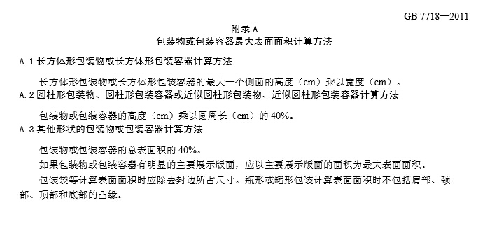 3.8 應使用規(guī)范的漢字(商標除外)。具有裝飾作用的各種藝術字,應書寫正確,易于辨認。 3.8.1 可以同時使用拼音或少數(shù)民族文字,拼音不得大于相應漢字。 3.8.2 可以同時使用外文,但應與中文有對應關系(商標、進口食品的制造者和地址、國外經(jīng)銷者的名 稱和地址、網(wǎng)址除外)。所有外文不得大于相應的漢字(商標除外)。 3.9 預包裝食品包裝物或包裝容器最大表面面積大于35cm2時(最大表面面積計算方法見附錄A),強 制標示內(nèi)容的文字、符號、數(shù)字的高度不得小于1.8mm。 3.10 一個銷售單元的包裝中含有不同品種、多個獨立包裝可單獨銷售的食品,每件獨立包裝的食品標識 應當分別標注。 3.11 若外包裝易于開啟識別或透過外包裝物能清晰地識別內(nèi)包裝物(容器)上的所有強制標示內(nèi)容或部 分強制標示內(nèi)容,可不在外包裝物上重復標示相應的內(nèi)容;否則應在外包裝物上按要求標示所有強制標 示內(nèi)容。