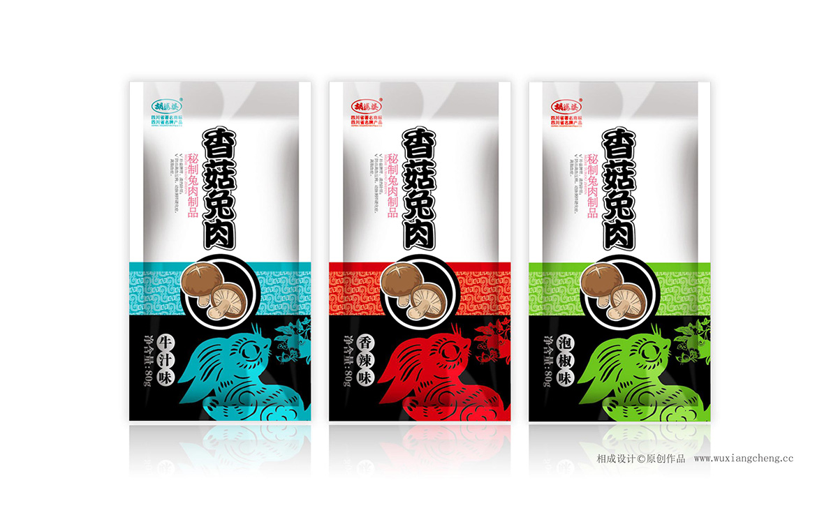 遵循這一理念,相成品牌設(shè)計(jì)對(duì)于香菇兔肉這個(gè)系列的包裝設(shè)計(jì)做了全面的塑造。首先從產(chǎn)品名稱分析,兔肉,第一聯(lián)想就是關(guān)于兔子的視覺(jué)符號(hào),但是這個(gè)兔子怎么表現(xiàn)呢?是不是放一個(gè)真實(shí)的兔子或者是兔肉上去呢?不是不可以,而是你想塑造的是一種什么樣的概念。這里面相成品牌設(shè)計(jì)考慮到這是一款素食產(chǎn)品,所以真實(shí)的肉明顯不適合這款產(chǎn)品的視覺(jué)符號(hào)代表。