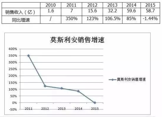莫斯利安是光明目前第一大爆品,莫斯利安常溫酸奶由光明乳業(yè)于2009年推向市場(chǎng),自推出以來(lái)銷售收入一直快速增長(zhǎng),直到2015年這種連年翻番的增長(zhǎng)勢(shì)頭才戛然而止。2014年實(shí)現(xiàn)約60億元,而2015年收入58.74億元。