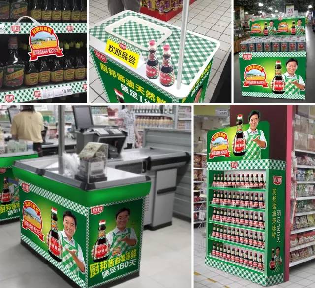 每一個廚邦醬油的標(biāo)貼用了辨識度極高的“格子”元素讓家庭主婦們看到就會想到家里的餐桌,建立這樣一個強關(guān)聯(lián):廚邦醬油=家庭餐桌必備。在超市貨架上整齊的擺放一起,真是如桌布一樣,在看看超市里其他競品,為了展示自己而展示,都這樣反而嵌入了辨識不夠清晰的環(huán)境中。