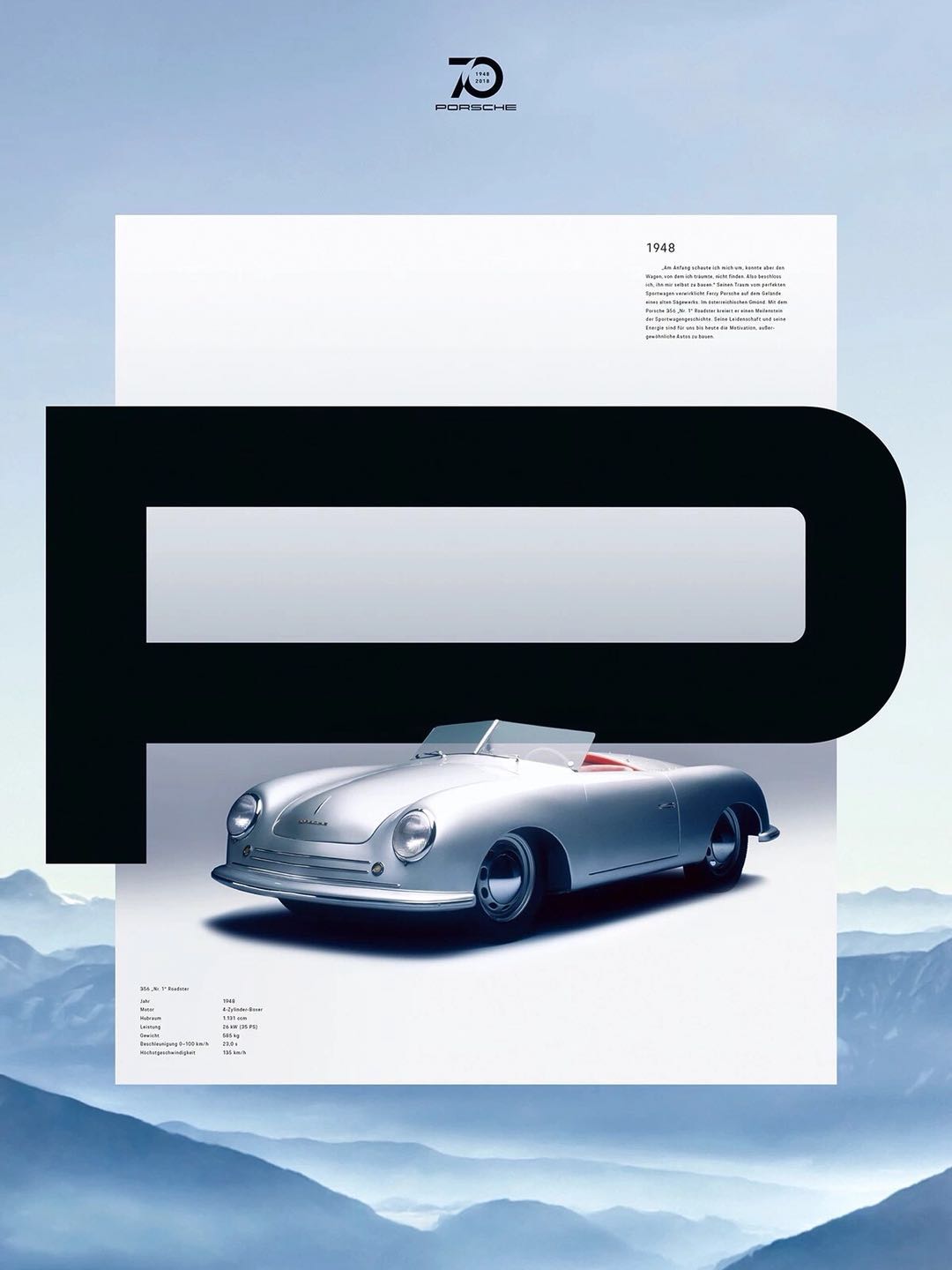 色彩呼應(yīng)的最終目的就是解決畫面的協(xié)調(diào)統(tǒng)一,看下保時(shí)捷的70周年的海報(bào)品牌包裝設(shè)計(jì)。